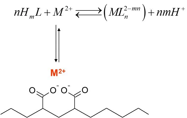 The image is intended to illustrate that when an ion (like lead) is part of a complex, only a small portion moves onto the solid phase thus increasing the retention times. This allows the chromatographer to enhance separation of overlapping peaks thus achieving selectivity.